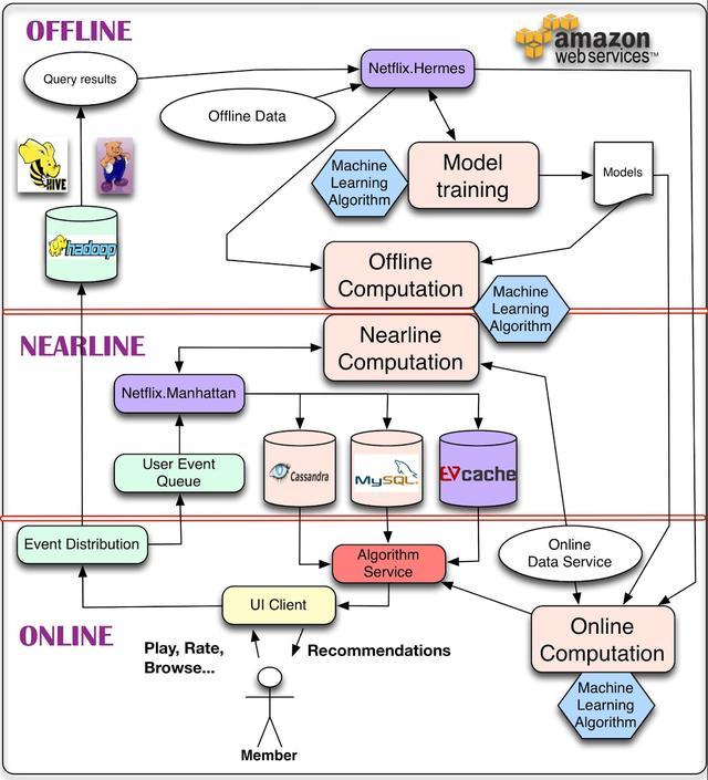 另一方面,离线计算允许在算法方法上有更多的选择,比如复杂的算法,并且对使用的数据量有更少的限制。一个简单的例子可能是定期聚合来自数百万电影播放事件的统计数据,以编译推荐的基准流行度指标。离线系统也有更简单的工程需求。例如,可以很容易地满足客户机施加的宽松响应时间sla。可以在生产环境中部署新的算法,而不需要在性能调优方面投入太多精力。这种灵活性支持敏捷创新。在Netflix,我们利用这个来支持快速实验:如果一个新的实验算法执行慢,我们可以选择简单的部署更多的Amazon EC2实例来达到所需的吞吐量运行实验,而不是花费宝贵的工程时间算法的优化性能,可能小的业务价值。然而,由于离线处理没有很强的延迟需求,它不会对上下文或新数据中的更改做出快速反应。最终,这可能导致过时,降低成员的体验。离线计算还需要存储、计算和访问大量预计算结果集的基础设施。