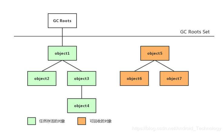 在主流的商用程序语音(Java、C#)的主流实现中,都是通过可达性分析算法(也可称为根搜索算法)来判断对象是否存活的。该算法是从离散数学中的图论引入的,这个算法的基本思路是: 通过一系列称为“GC Roots”的对象作为起始点,从这些节点开始向下搜索,搜索所走过的路称为引用链(Refence Chain),当一个对象到GC Roots没有任何链表相连(用图论的话来说,就是GC Roots到这个对象不可达)时,则证明此对象不可用 。下图所展示的,对象object5、object6、object7虽然互相有关联,但是他们到GC Roots是不可达的,所以他们将会被判定是可回收的对象。