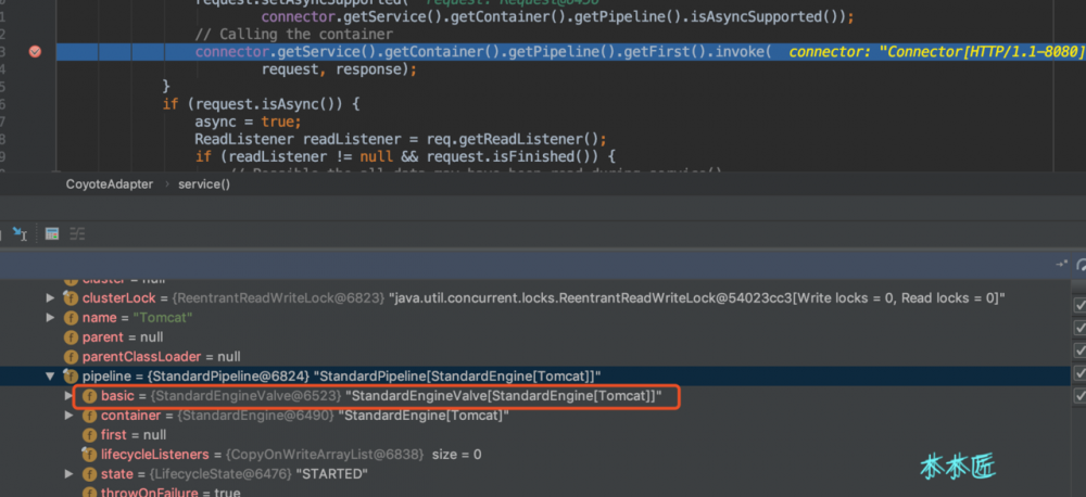 根据如上代码,我们知道了 basic 是一个管道( Pipeline )中的最后一个阀门,按道理只要最后一个阀门是下一个容器的第一个阀门就可以完成全部的链式调用了。我们用一个请求debug下看看是不是和我们的猜测一样,我们在 CoyoteAdapter 中的 service 方法中打个断点,效果如下: