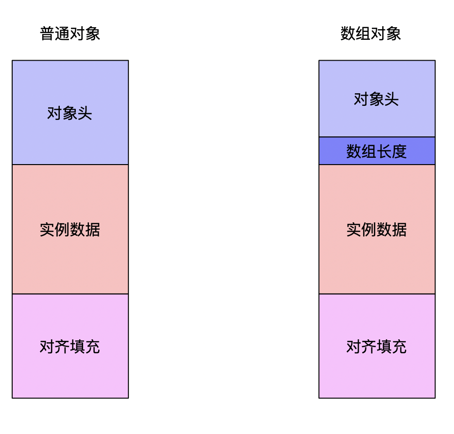 一个对象根据不同情况可以被划分成两种情况,当对象是一个非数组对象的时候,对象头,实例数据,对齐填充在内存中三分天下,而数组对象中在对象头中多了一个用于描述数组对象长度的部分