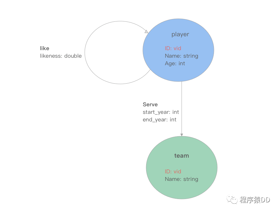 回到上面的图例,图中有两种类型的边,一种为 player 指向 player 的 like 关系,属性为 likeness (double);另一种为 player 指向 team 的 serve 关系,两个属性分别为 start_year (int) 和 end_year (int)。