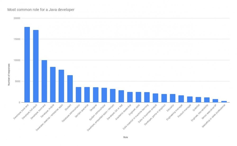 不出所料的是,大多数 Java 开发者把自己当做是后端开发工程师,在服务器上编写程序,并关联相关的数据库。这与很多企业使用 Java 的业务场景相吻合。Java 被用于开发并支持通常被企业内部和客户所使用的服务器端程序。