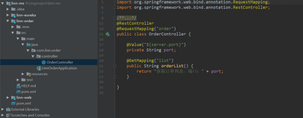 在之前的order-service项目中 写一个简单的服务,如下,提供一个获取订单服务列表的服务