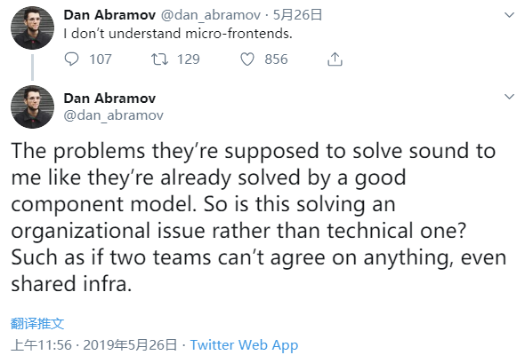 Dan Abramov(你应该知道他是谁) 在 Twitter 上提出过一个问题 ,他认为微前端解决的问题通过好的组件模式就能解决,为什么需要微前端?