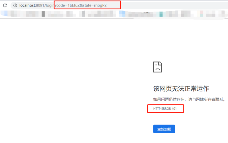 浏览器上访问测试接口 localhost:8091/client/1 ,跳转到授权服务登陆界面,登陆成功后,跳转回到客户端的 /login 地址 (即 我们 配置的 spring.security.sso.login-path ),正常情况下会再次跳转到 localhost:8091/client/1(这次已经是认证成功后访问)。这整个流程就是Oauth2 的授权码模式流程。但现在有这么一个问题,在授权服务回调到客户端的 /login 地址时,浏览器显示 HTTP ERROR 401, 如下图: