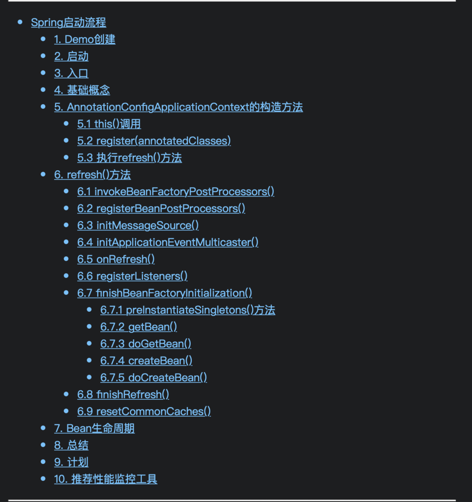 Spring 的启动流程,通过 AnnotationConfigApplicationContext 的有参构造方法入手,重点分析了 this() 方法和 refresh() 方法。在 this() 中初始化了一个 BeanFactory ,即 DefaultListableBeanFactory ;然后向容器中添加了7个内置的 bean ,其中就包括 ConfigurationClassPostProcessor 。 refresh() 方法中,又重点分析了 invokeBeanFactoryPostProcessor() 方法和 finishBeanFactoryInitialization() 方法。 invokeBeanFactoryPostProcessor() 方法中,通过 ConfigurationClassPostProcessor 类扫描出了所有交给 Spring 管理的类,并将 class 文件解析成对应的 BeanDefinition 。 finishBeanFactoryInitialization() 方法中,完成了非懒加载的单例 Bean 的实例化和初始化操作,主要流程为 getBean() ——> doGetBean() ——> createBean() ——> doCreateBean() 。在 bean 的创建过程中,一共出现了 8 次 BeanPostProcessor 的执行,在这些后置处理器的执行过程中,完成了 AOP 的实现、 bean 的自动装配、属性赋值等操作。 Spring 中单例 Bean 的生命周期。 本文主要介绍了 Spring 的启动流程,但对于一些地方的具体实现细节没有展开分析,因此后续Spring源码分析的计划如下: