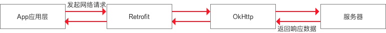 可以看到App应用层是通过Retrofit请求网络,然后使用Retrofit接口层封装请求参数、Header、URL等信息,然后由OkHttp完成后续的和服务器的交互。 而服务器返回响应数据后,也是先返回给OkHttp,然后OkHttp将原始结果返回给Retrofit,Retrofit根据用户的需求对原始数据进行解析封装,并返回给App应用层。
