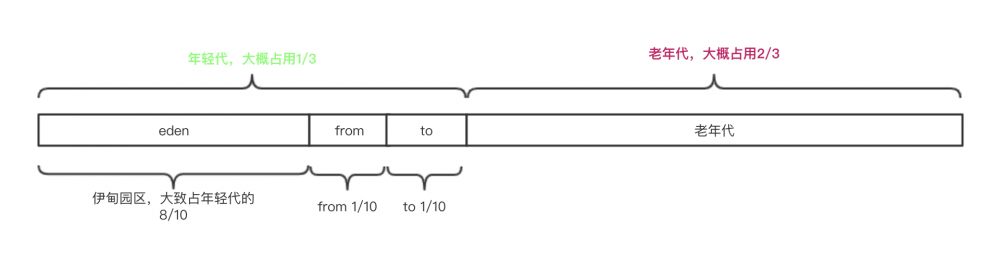 如果都为默认设置,大致就是这样的。假设我们设置内存堆的大小为600M,那么老年代就大概是400M,我们的年轻代就是200M,然后年轻代的eden区域占160M也就是200M的8/10,一般新建的对象都在这,我是说一般啊。后面会用这个600M来详细说明,from和 to区域各占20M,也就是Survivor区域占用40M,每次做完minor GC,对象就放在这个区域。
