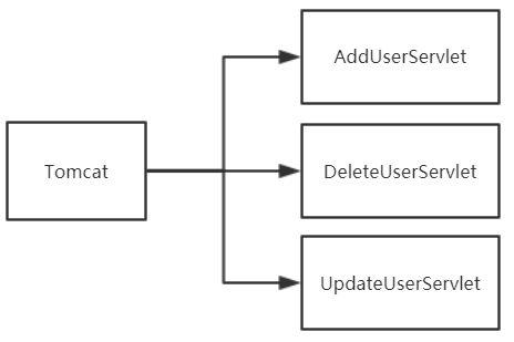 这个时候请求分发的工作是在Tomcat中完成的,通常一个业务对应一个Servlet。比如说关于用户的增删改查,对应的Servlet很有可能是这样子的: