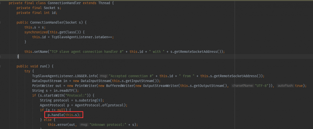Jenkins cli的入口在这 hudson.TcpSlaveAgentListener#ConnectionHandler ,这个run构造方法,我们看到调用了p.handle方法。