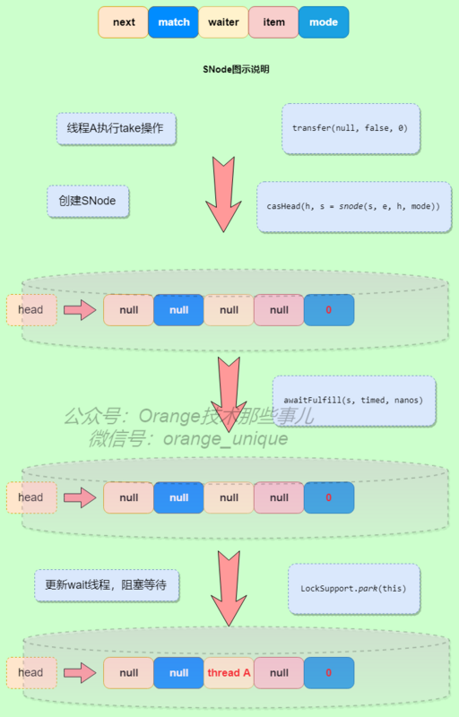SNode基于栈的节点实现,变量与QNode有些不同,其中match在两个操作匹配上之后可以通过这个变量找到其匹配的节点,节点类型mode在使用上也有所不同,下面使用到时会进行说明,其他参数可参考TransferQueue的QNode说明