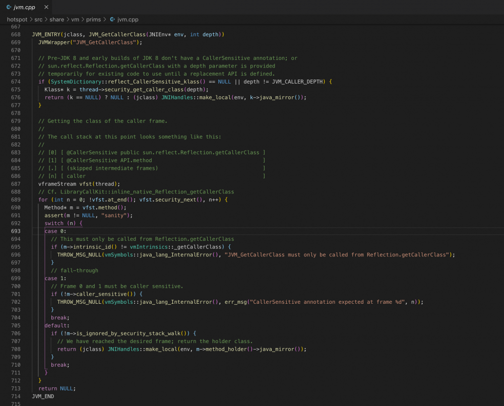 这是一个native方法,我们从openJDK源码中去找它的JNI入口(Reflection.c)