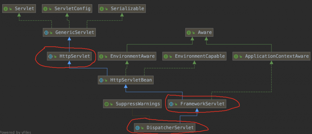 Idea 中查看继承关系,我们主要关心的是 HttpServlet ,FrameworkServlet,DispatcherServlet。