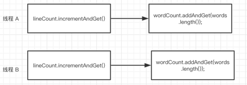结果显而易见,这段代码不是线程安全的。因为 lineCount 和 wordCount 是两个变量,尽管它们各自是线程安全的,但线程 A 进行 lineCount 加 1 的时候,并不能够保证线程 B 是在线程 A 执行完 wordCount 统计后开始 lineCount 加 1 的。