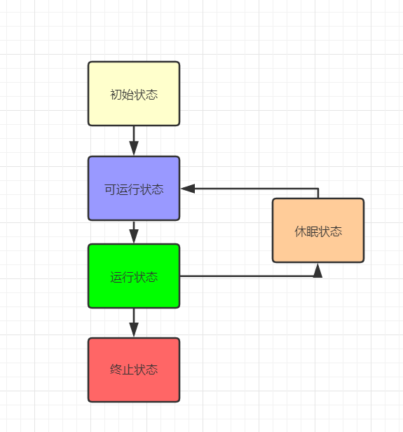 可以用如下图所示的 “五态模式” 来描述,分别为: 初始状态、可运行状态、运行状态、休眠状态、终止状态。