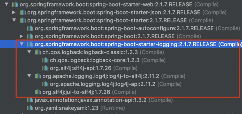 如果你引入了 Web Starter ,它会自动引入入 Logging Starter ,后者会引入Logback以及SLF4J,你可以使用SLF4J的API来编写log代码,实际底层会调用Logback。另外Logging Starter还包含了log4j-api依赖,用此依赖你可以使用Log4j2的API来编写代码,但是Logging Starter并没有使用引入log4j-core这个具体实现,而是用了log4j-to-slf4j这个实现,它将Log4j2的调用转发到SLF4J上。