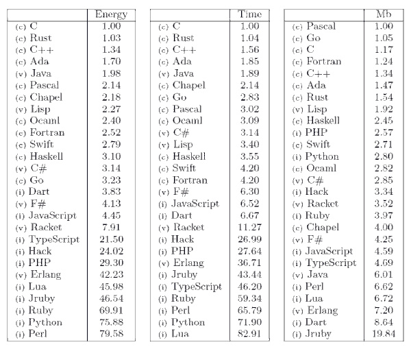 当您尝试衡量编程语言的效率时,会出现很多问题。首先,您使用什么样的指标?更快的程序语言是一种更节能的语言吗?更快的编程语言是更环保的吗?