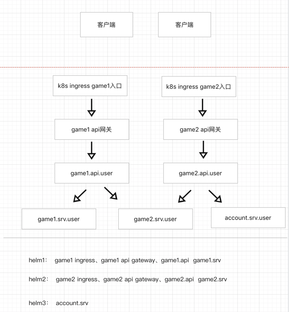 game1需要访问account项目,只需使用 account.srv.account 和对应的proto创建客户端;需要访问game2项目,只需使用 game2.srv.user 和对应的proto创建客户端。即使他们之间不在同一个服务发现里,也没有关系,创建客户端时增加服务发现的选项即可。