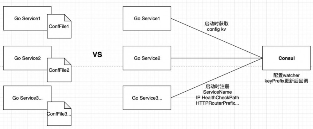 最开始,我们用业界常用的 Consul 实现服务配置和服务注册与发现。 Consul 作为服务配置中心解决了什么问题呢?假设你有几十上百个微服务实例部署在不同的服务器,每个实例都有相关的配置文件,那么查看或修改配置的时候需要登录机器去操作。用 Consul 作为服务配置中心的话,服务启动时从 Consul 中同步配置,通过配置 watcher 回调触发服务配置热更新。这样你可以在一个地方去查看或修改服务配置并生效,而不用一个个去登录机器去查看或修改配置文件。