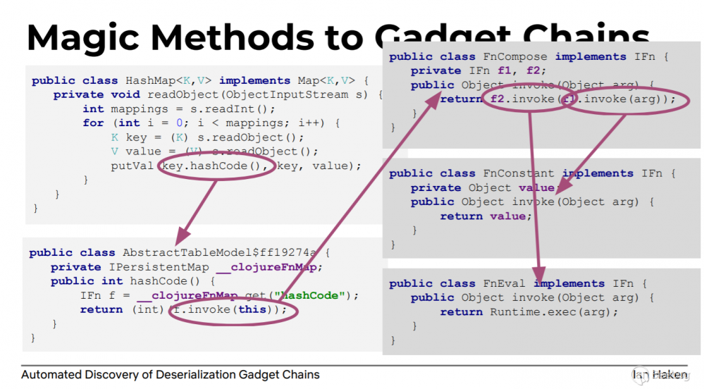 作者给出了一个从Magic Methods(source)->Gadget Chains->Runtime.exec(sink)的例子: