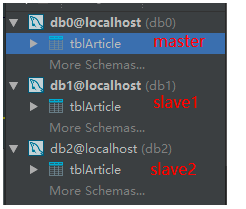 由于测试资源优先在本地模拟创建3个数据库,分别是1个master库2个slave库,里面分别都有一个tblArticle表,内容也大致相同(为了演示主从效果,我把从库中表的title列值增加了slave字样):