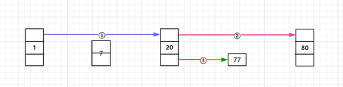 另外上图中体现了一个 高度 的概念,如上面的第二步,我们从20开始向后查找到的节点是80而不是77,因为当时我们处于20的第三层高度,而第三层高度是指向80的,所以我们只会查找到80,但是对比发现80嫌大,所以便往下退一层,即第二层,而第二层也是指向80的,再向下到达了第一层,第一层指向的节点是77,此时正好找到了目标值。