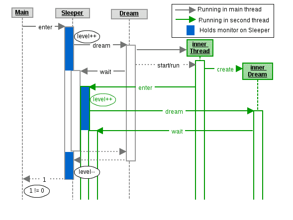 我们如何应用它来解决这个难题?当我们进入外部梦境时,我们用 wait来释放监视器。但首先我们启动一个单独的线程,这也将进入一个梦想。进入那个内心的梦想,让第二根线程占据了显示器。所以在内心的梦里,我们用 wait再次来释放监视器。这允许主线程停止等待,取回监视器,并离开外部梦想。我们就在那里:我们已经从外梦中醒来,回到了我们开始的地方,但是梦中的梦在第二个线程中继续。