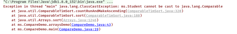 看异常信息可以看到Student不能被转换为Comparable,标志着我们的Student类需要实现Comparable接口。那么我们就来试试实现Comparable接口的情况