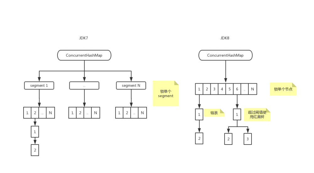 1. 用 Synchronized + CAS + Node + NodeTree 代替 Segment ,只有在hash 冲突, 或者修改已经值的时候才去加锁, 锁的粒度更小,大幅减少阻塞 2. 链表节点数量大于8时,会将链表转化为红黑树进行存储,查询时间复杂度从O(n),变成遍历红黑树O(logN)。复制代码