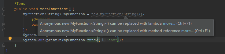 Java的lambda表达式基本上是对函数式接口实现的一种简化 —— 用lambda表达式直接代替一个函数式接口的具体实现(抽象方法的实现)。当我们使用jdk8在IDE中编写1中代码时,IDE会给出提示,