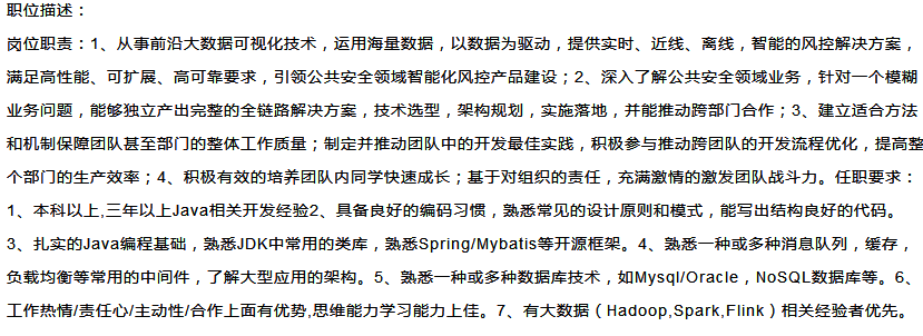 1、3年经验,熟悉常用类库 2 熟悉Spring和Mybatis框架 3 熟悉分布式中间件(比如消息,缓存等中间件) 4 熟悉数据库,最好是NoSQL 5 最好有大数据经验