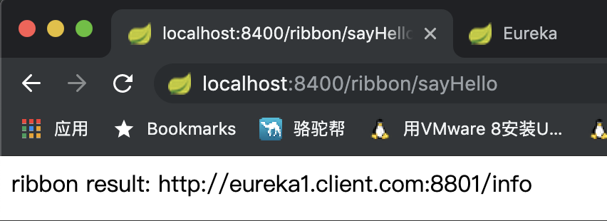 打开浏览器,分别输入http://localhost:8400/ribbon/sayHello, http://localhost:8400/eureka-feign/feign/sayHello,显示结果分别如下: