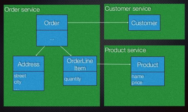 让我们用具体的例子来看一下。在下面的例子中,有三个微服务,“Order Service”, “Customer Service” 和“Product Service”.