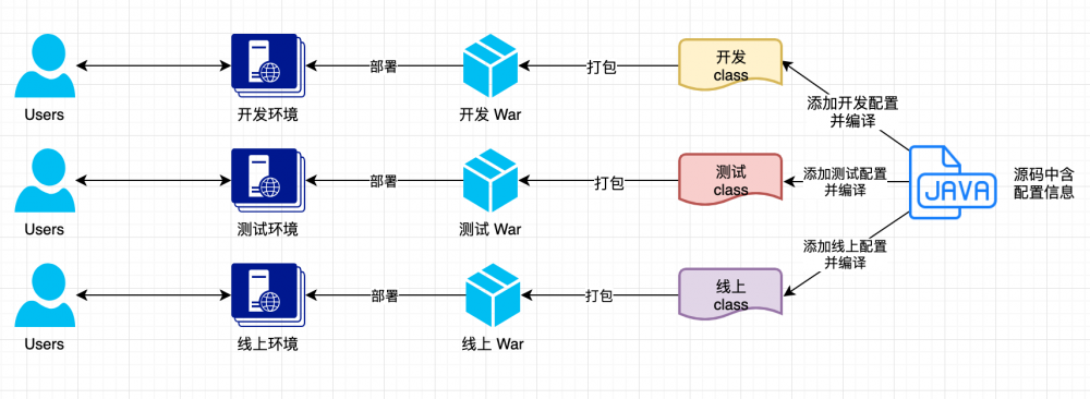 相信,这应该是使用最普遍的一种配置管理策略。但该方案存在一个问题,每个环境使用不同的部署包,结果便是测试使用的部署包与线上使用的并非 100% 相同。