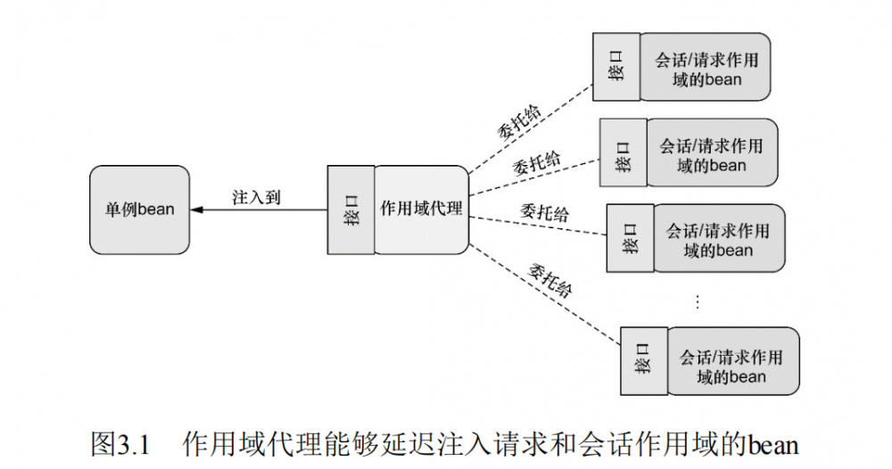 而是当请求到来的时候创建。当会话到来时,spring注入的并不是实际的购物车bean,而是购物车bean的代理。那么创建的时机: