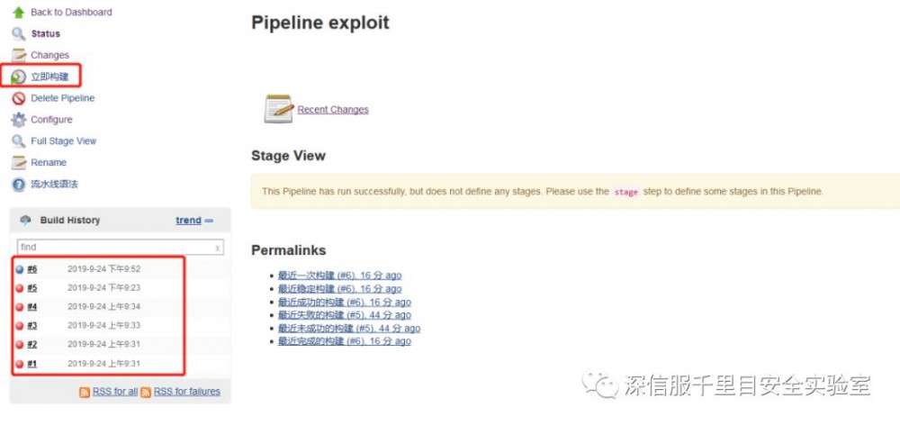 创建流水线项目,并在pipeline模块下插入构造好的恶意pipeline脚本,保存项目并构建项目,此时会看到构建好的项目列表。