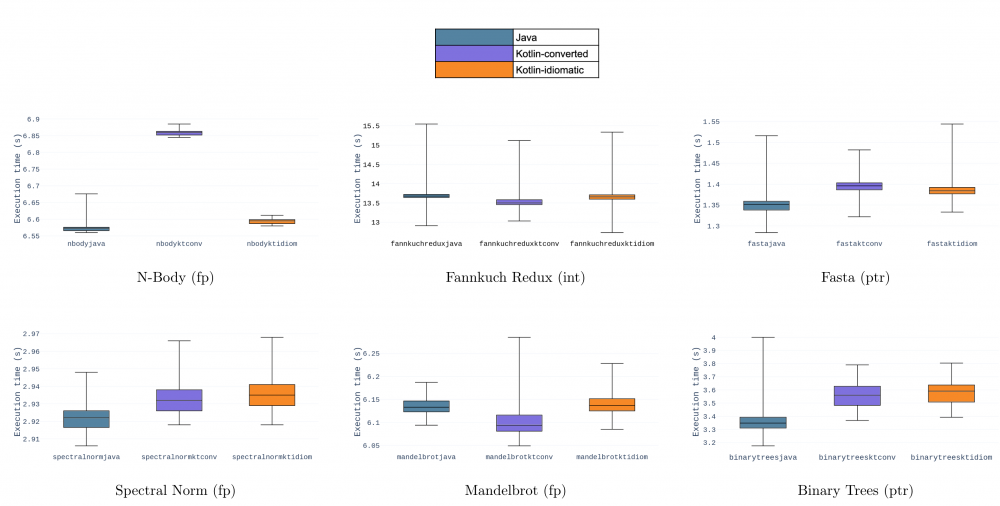 从执行时间的角度来看,最高和最低的中位数,在运行时间之间的最大差异可以在 6.7%(支持 Java 实现二叉树基准测试) 到 1.2%(支持 kotlin 转换的实现 Fannkuch Redux 基准测试) 之间。 kotlin 的惯用实现版本 没有 在一个 基准测试 中 **** 达到最佳的执行时间。 Java 代码在 6 个基准测试中有 4 个达到了最佳时间的中位数,其余的基准测试在 kotlin 转换的代码中执行得最好。