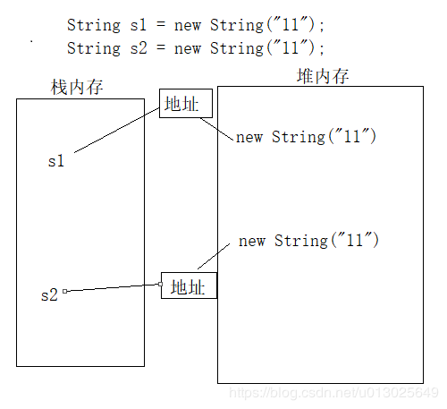 s1和s2都分别存储的是相应对象的地址。所以如果用 s1== s2时,比较的是两个对象的地址值(即比较引用是否相同),为false。而调用equals方向的时候比较的是相应地址里面的值,所以值为true。这里就需要详细描述下equals()了。