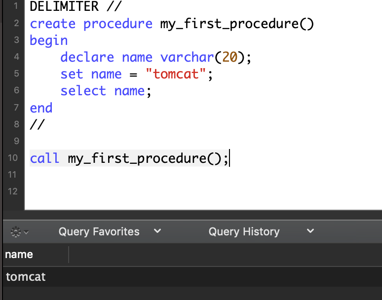 DELIMITER // create procedure my_first_procedure() begin declare name varchar(20); set name = "tomcat"; select name; end //