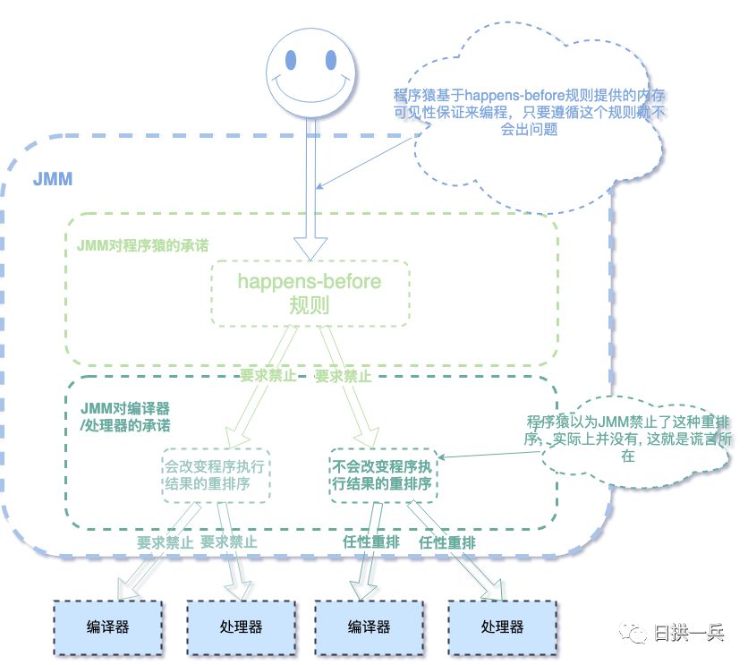 为了满足二者的强烈需求,照顾到双方的情绪,于是乎: JMM 就对程序猿说了一个善意的谎言: 「会严格遵守 Happpen-Befores 规则,不会重排序」让程序猿放心,私下却有自己的策略: