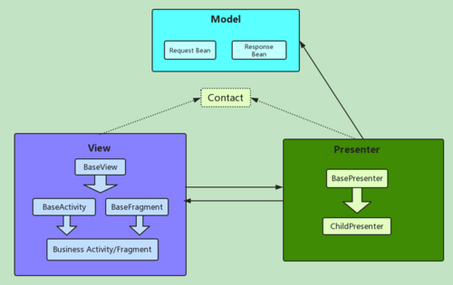 由于 Presenter 需要和 View 层通信,所以 Presenter 需要持有 View 层实例 所以 我们可以写一个BasePresenter 类,并且在构造函数中传入 View接口实例,View用泛型约束,使得 View 接口是 BaseView 的子类接口,并在该类中可以写一些常用到的Presenter 通知 View 的方法,或者子 Presenter 需要常处理的逻辑。