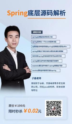 为了让各位 未来的技术大牛们 ,能在 最短的时间 系统全面的 学习Spring,我们特地邀请到前谷歌、天猫电商资深架构师 子路老师 ,为我们带来了这堂 《Spring底层源码解析》 专题课程。原价 199元 ,本号粉丝限时特惠 0.02元 。