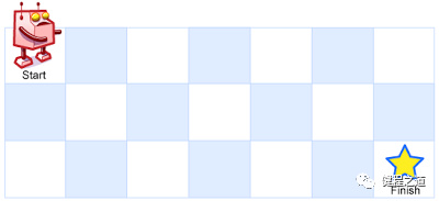 机器人每次只能向下或者向右移动一步。机器人试图达到网格的右下角(在下图中标记为“Finish”)。