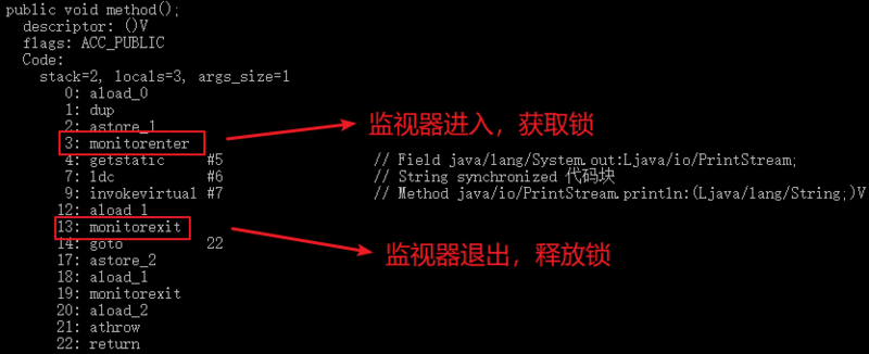 synchronized 修饰的方法的同步并没有 monitorenter 指令和 monitorexit 指令完成(理论上其实也可以通过这两条指令来实现),不过相对于普通方法,其常量池中多了ACC_SYNCHRONIZED标示符。JVM就是根据该标示符来实现方法的同步的:当方法调用时,调用指令将会检查方法的 ACC_SYNCHRONIZED 访问标志是否被设置,如果设置了,执行线程将先获取monitor,获取成功之后才能执行方法体,方法执行完后再释放monitor。在方法执行期间,其他任何线程都无法再获得同一个monitor对象。 其实本质上没有区别,只是方法的同步是一种隐式的方式来实现,无需通过字节码来完成。