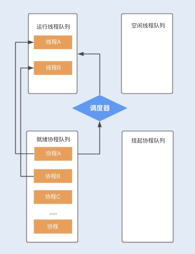 - 当协程A调用 暂停方法 或 被阻塞 时,协程A会进入到 挂起队列 ,调度器会调用 等待队列 中的其他协程 抢占 线程A执行