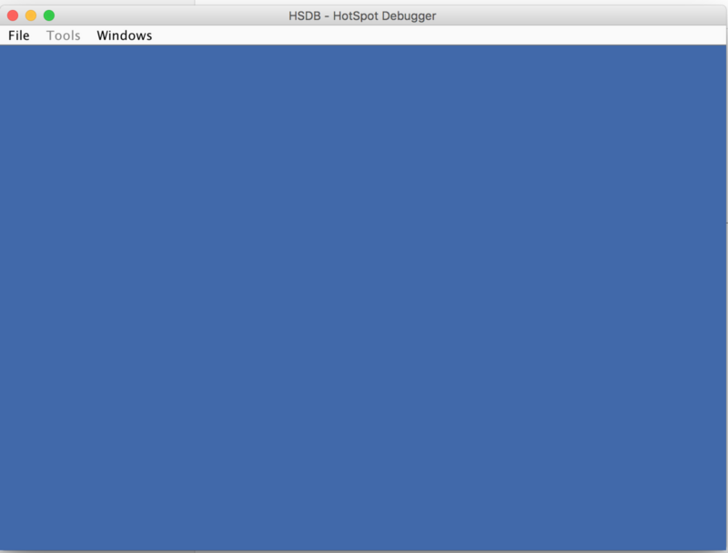 - SA HSDB的入口在$JAVA_HOME/lib/sa-jdi.jar中,main方法在sun.jvm.hotspot.HSDB中,因此使用命令:sudo java -cp $JAVA_HOME/lib/sa-jdi.jar sun.jvm.hotspot.HSDB,就可以启动HSDB调试器(入下图所示)