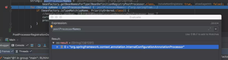 5. 第一次执行 beanFactory.getBeanNamesForType(BeanDefinitionRegistryPostProcessor.class, true, false); 方法,从容器中获取 BeanDefinitionRegistryPostProcessor 类型的Bean的name(这里只是获取名称,还没有实例化Bean)。注意,程序执行到这里,Spring还没有扫描包,还没有将项目中的Bean注册到容器中。默认情况下,这里返回的数据为如下图所示。回忆一下,这个 BeanDefinition 是在什么时候被加入到 BeanFactory 的呢?是在 AnnotationConfigApplicationContext 的无参构造器中创建 reader 时注册的 BeanDefinition 。其中BeanName为 org.springframework.context.annotation.internalConfigurationAnnotationProcessor ,对应的Class为 org.springframework.context.annotation.ConfigurationClassPostProcessor Spring5源码解析4-refresh方法之invokeBeanFactoryPostProcessors
