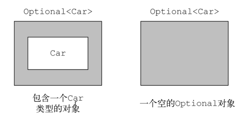 使用Optional而不是null的一个非常重要而又实际的语义区别是,第一个例子中,我们在声明变量时使用的是Optional<Car>类型,而不是Car类型,这句声明非常清楚地表明了这里发生变量缺失是允许的。与此相反,使用Car这样的类型,可能将变量赋值为null,你只能依赖你对业务模型的理解,判断一个null是否属于该变量的有效值又或是异常情况。