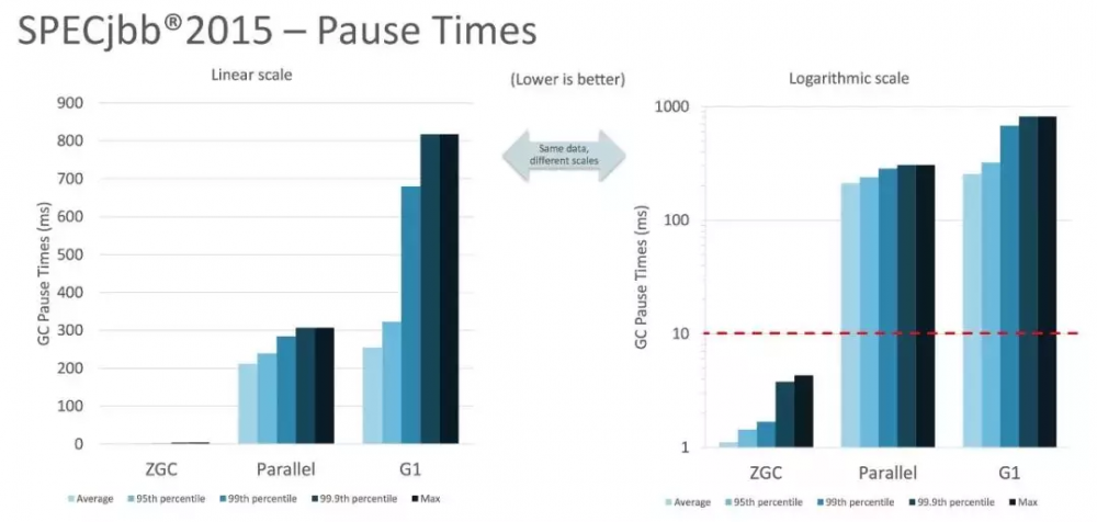ZGC来了 !!! Java程序员可以光荣的远离讨厌的GC停顿和调优了。ZGC的成绩是,无论你开了多大的堆内存(128G?2T?),硬是能保证低于10毫秒的JVM停顿。远低于最初的G1 avg:156.806ms。ZGC的目标保守的10ms,也远胜前代的G1 。