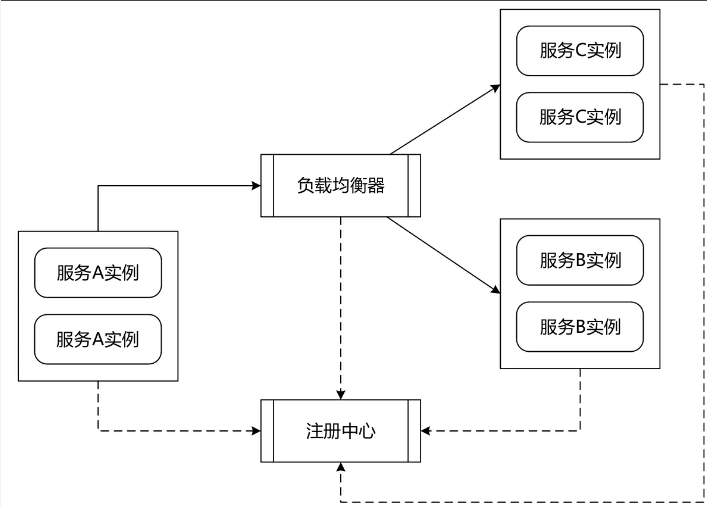 三个服务A,B,C都是多实例部署在集群环境中,都需要到注册中心注册,B,C作为A的服务提供者,A需要通过负载均衡器找到B,C完成服务调用,负载均衡器从注册中心获取服务的定义信息。